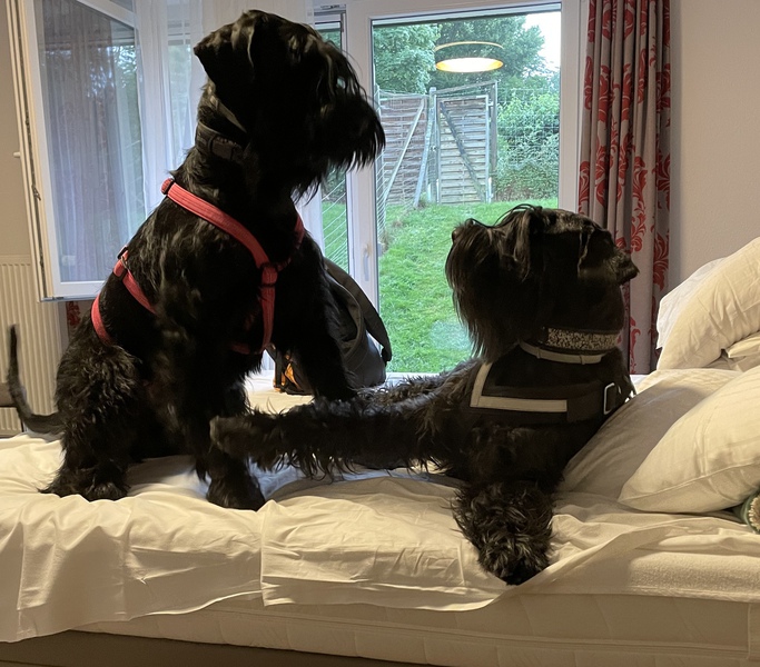 Wir genießen unser Zimmer mit eingezäuntem Wiesenteil (Bonny und Yara haben gleich mit den Nachbarhunden Freundschaft geschlossen.
